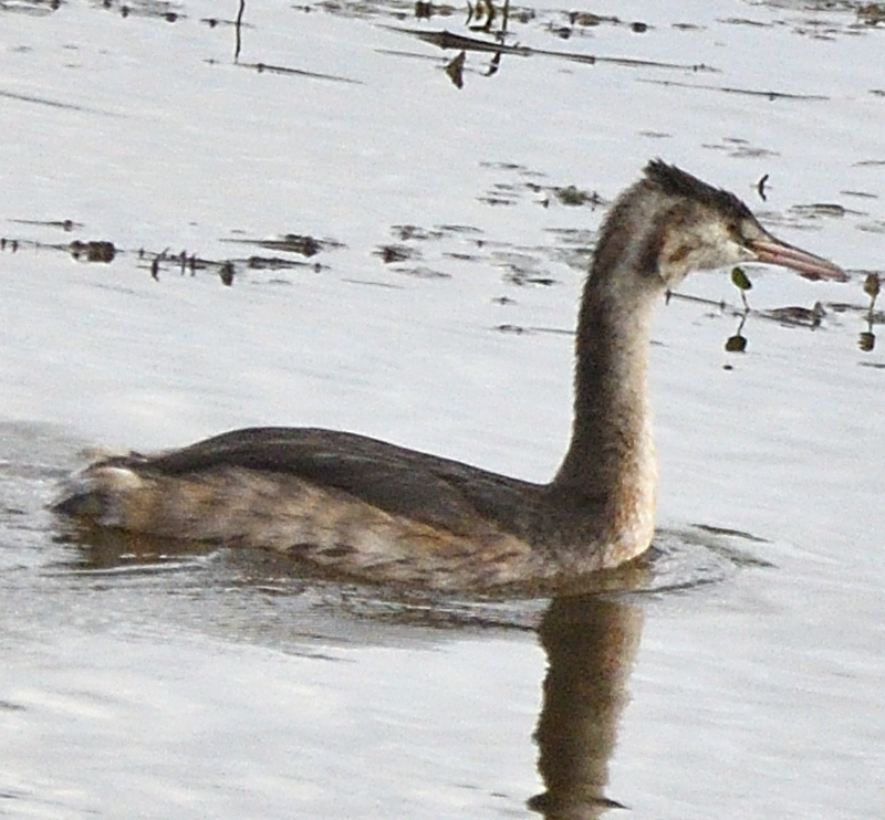 C-中洲の横を中の橋の方へ向かって泳いでゆくカンムリの幼鳥を発見します